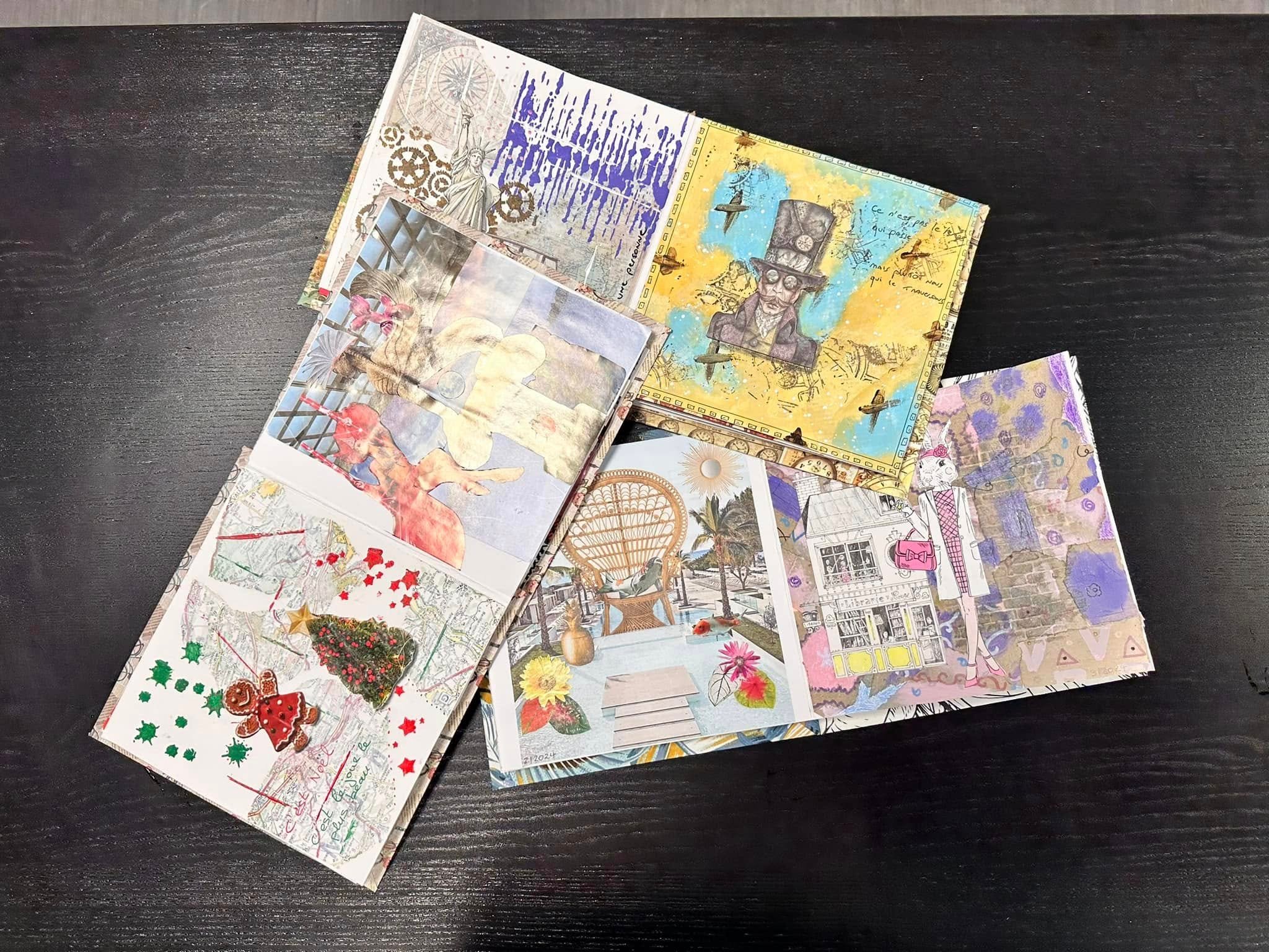 La pratique du Art Journal dans cet Atelier vous permettra d’explorer et de mélanger différentes techniques mixtes ( Encres, Tampons, Collage, Feutres, Ecriture, Acrylique, Aquarelle, Photos, Découpages, Effets reliefs …). Celle-ci pourra combiner les images et mots, jouer avec les couleurs pour créer des fonds de pages, coloriser et superposer des embellissements, donner du sens en y associant des mots ou du texte et bien d’autres choses.