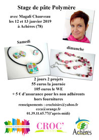 Le Centre Culturel d'Achères organise en partenariat avec Croc' Loisirs un atelier de pâte Polymère avec Magali Chauveau les 12 et 13 janvier 2019, de 9h00 à 18h00.
